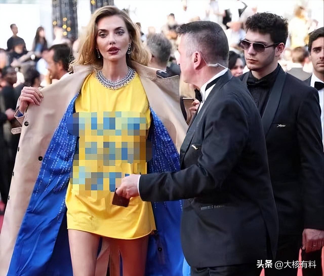 当天在戛纳国际电影节的红毯上,身材高挑的乌克兰模特拜科娃受邀出席,身穿一件米黄色风衣,来到场地中央的拍照区的时候,拜科娃却突然敞开了风衣。