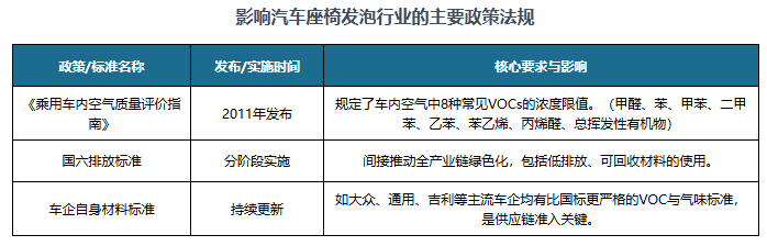政策法规的驱动具有强制性和前瞻性。例如,2011年中国首个针对乘用车内空气污染物控制的推荐性国家标准——GB/T 27630-2011《乘用车内空气质量评价指南》,规定了车内空气中8种常见VOCs的浓度限值。这不仅是产品准入的门票,更成为头部车企供应链管理的核心筛选条件。此外,围绕“双碳”目标,关于材料可回收率的法规预期也在推动行业开发生物基材料(如采用大豆油衍生物)和化学回收聚氨酯泡沫的解决方案,旨在构建从生产到废弃的全生命周期绿色闭环。